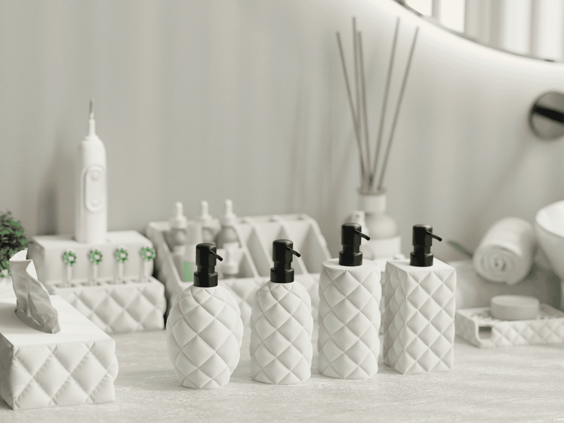 Functionele én stijlvolle badkameraccessoires, 3D-geprint in warme, minimalistische vormen. Perfect voor een rustgevende wellness-sfeer met natuurlijke, organische details.