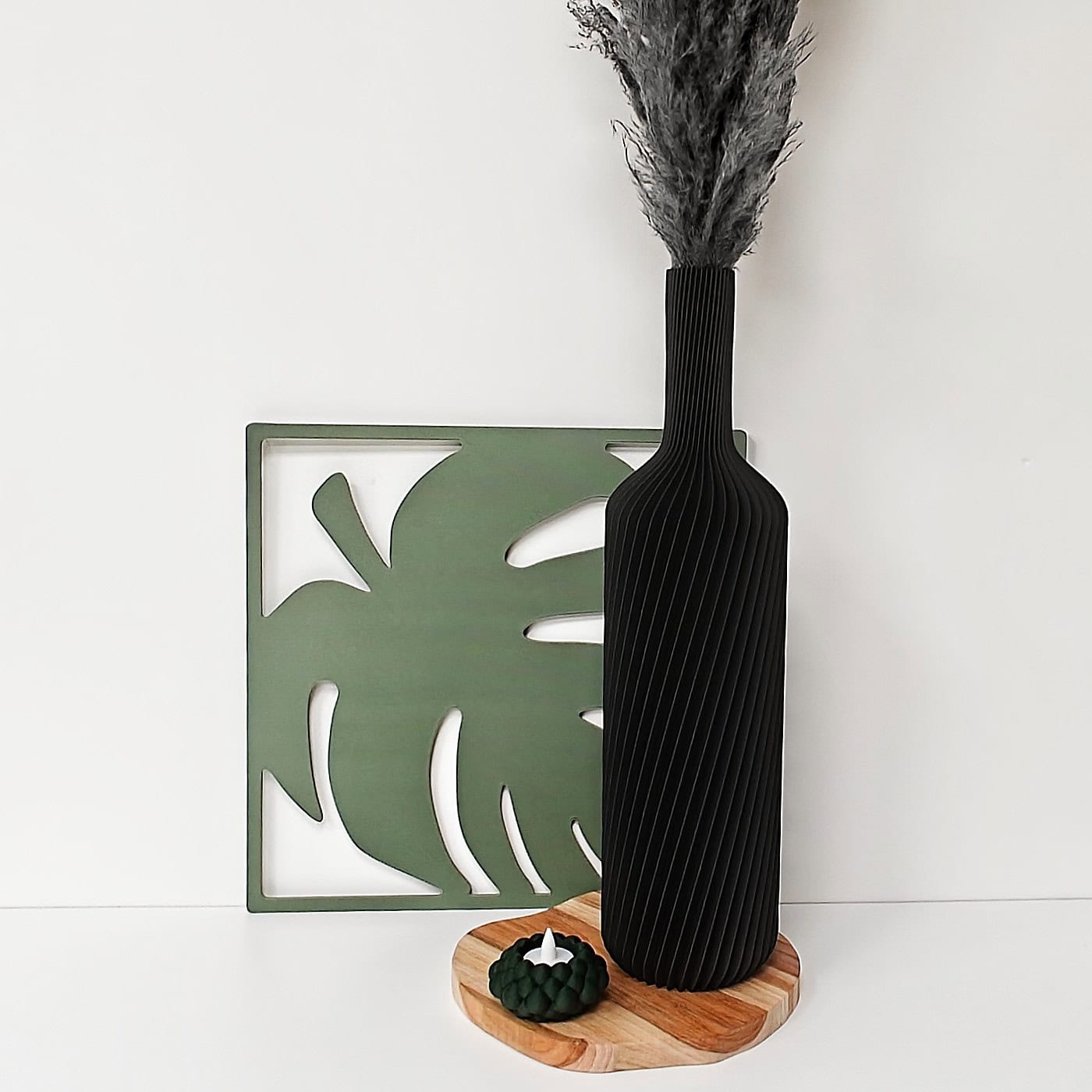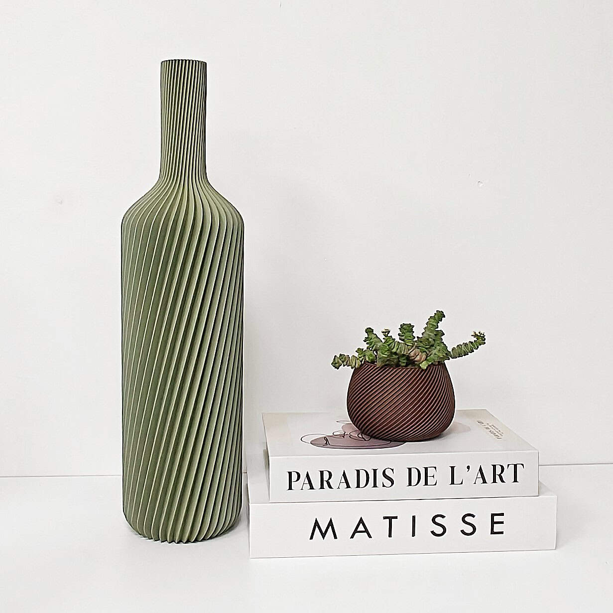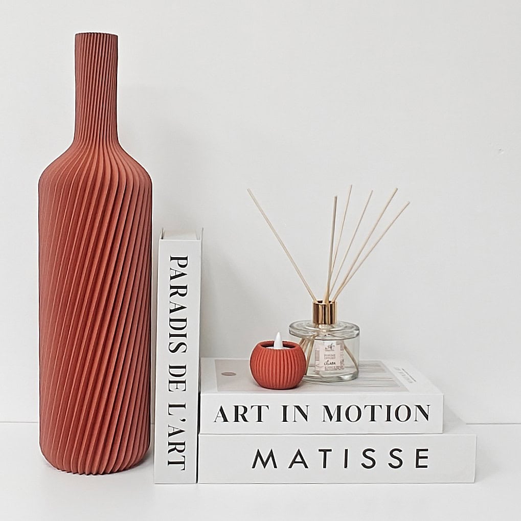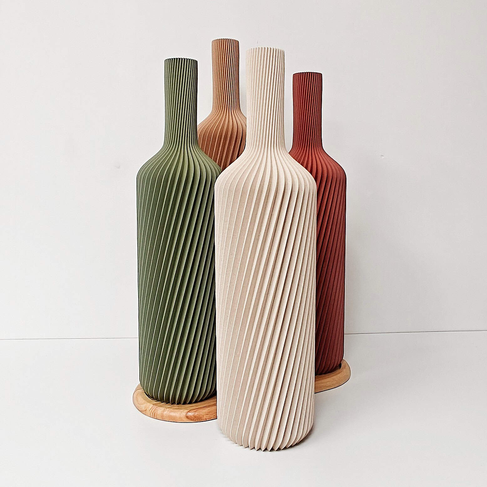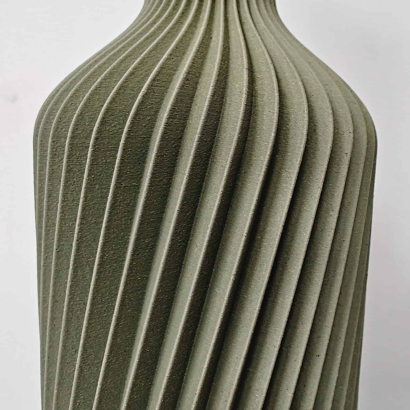 Elke vaas wordt lokaal 3D-geprint in wood-PLA, een biobased materiaal met echte houtdeeltjes. Hierdoor krijgt elke vaas een warme, natuurlijke uitstraling en een licht unieke textuur — geen twee stuks zijn exact hetzelfde.